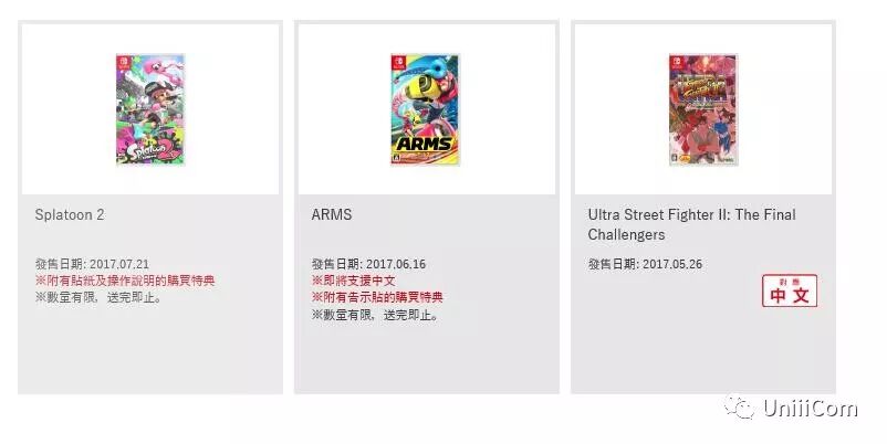 《ARMS》和《喷射战士2》是2017年上市的NS平台独占大作。上市日期为6月16日。新作《ARMS》是一款拳击类游戏,游戏利用伸缩拳的格斗游戏,在近处的话则是拳击游戏,在远处攻击则是可以像射击游戏一样,会追踪手的动作,手的动作改变的话可以改变拳头的方向与人物的方向。游戏支持分屏、本地面联以及WIFI联机。