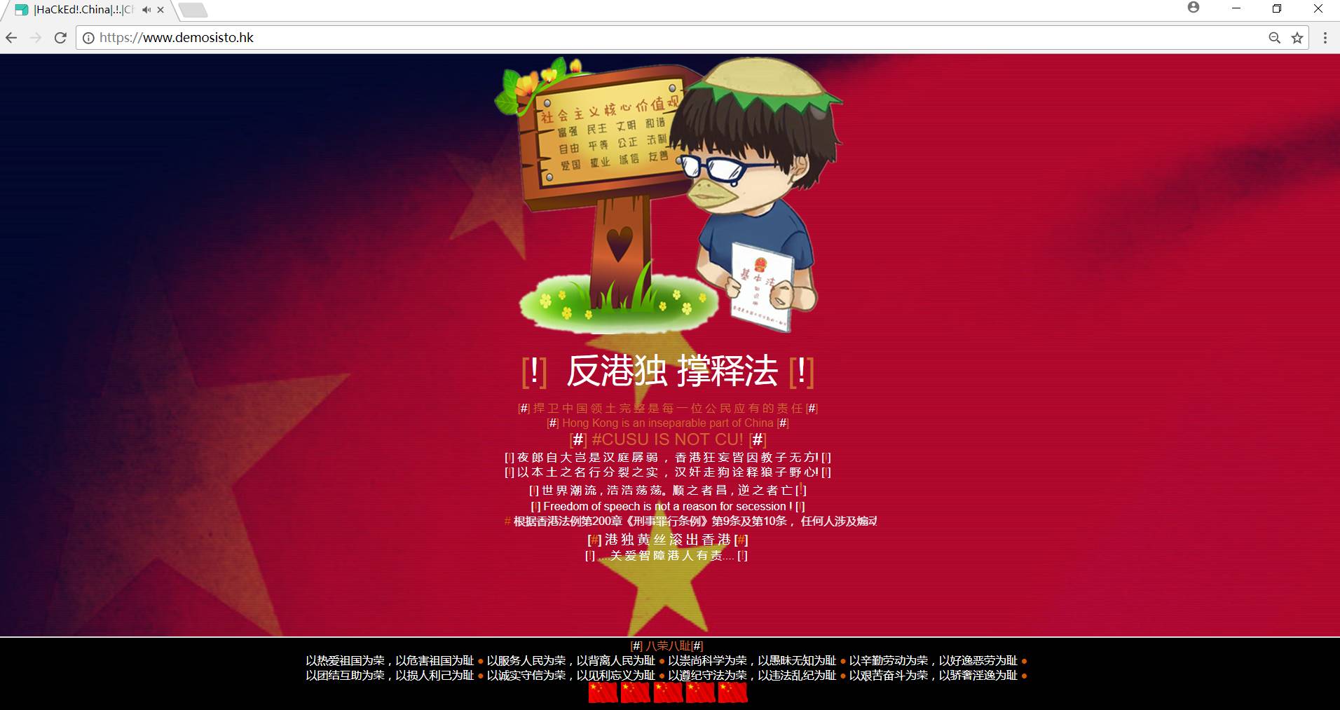 (香港众志官网网站,背景中国国旗,配图貌似是毒瘤类似猴子模样的漫画,手拿基本法小册子,