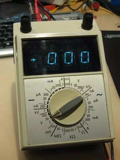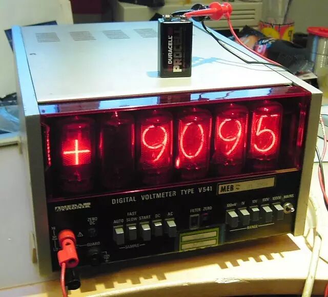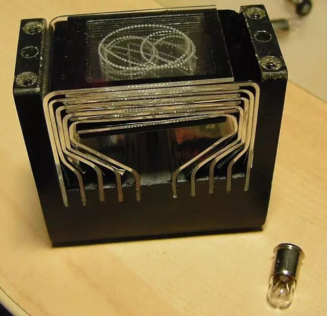 数码管(Nixie T)显示屏很怪对吧,从侧面看是多层阴极叠加在一起,每一层对应一个数字。