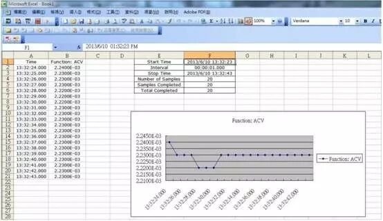 后面板标配USB Device接口以及可选配的GPIB接口,让用户能更方便的连接PC。固纬电子也提供了免费的USB 接口软件-ExcelADDins,此款软件简单方便,安装后Microsoft Excel将建立宏(Marco),直接控制万用表的设置,以及记录测量结果。更强大的是被记录的数据Excel绘图功能同步传成图表显示(如下图),更直观方便。前面标配USB Host接口,供用户直接插入U盘存储数据,这样不仅有效节约作业时间,更可以节省开发程序的时间和经费。