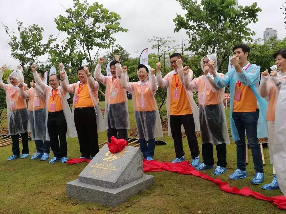 2017年6月,深港各界人士来到深圳湾公园,为深港青年庆祝回归二十周年纪念碑揭幕,并在望月山谷种下20棵紫荆树和20棵勒杜鹃树。左四为龙子明先生。