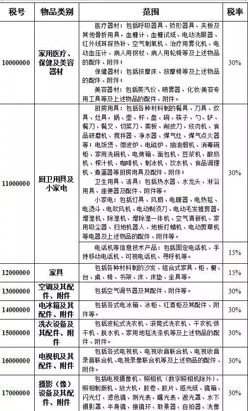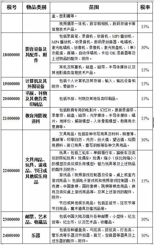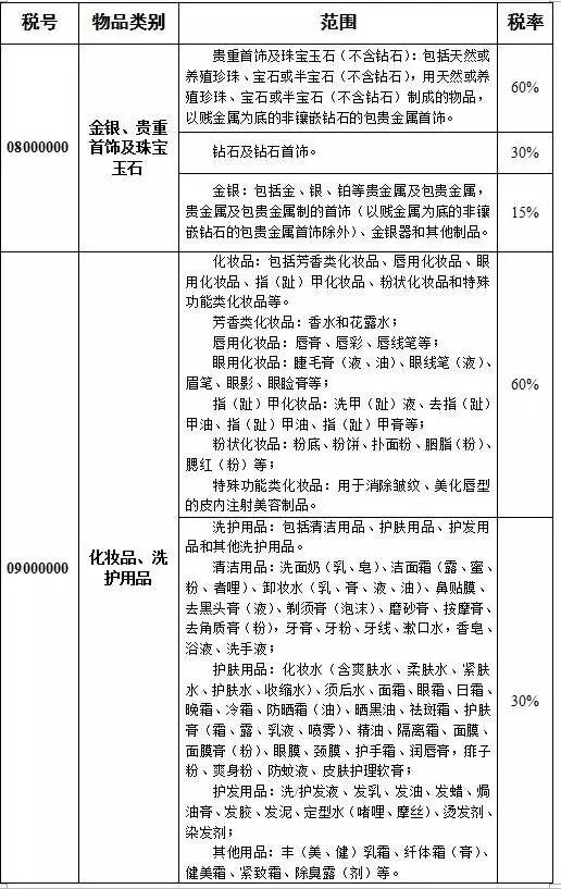 从2016年4月8日起,,其中食品饮料类税率是15%,烟酒类税率是60%,服装箱包鞋靴税率是30%,化妆品等税率是60%。