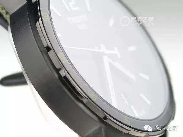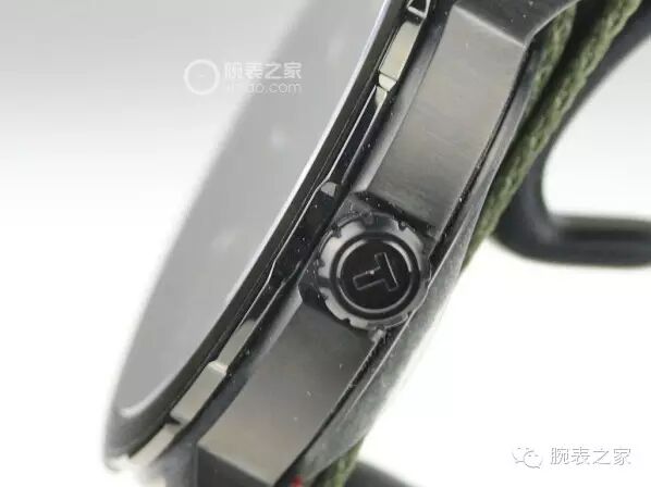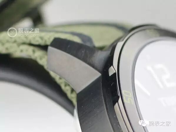 从无表冠处侧面看,表壳厚度很有分量感,侧面经拉丝处理很有质感。磨砂的表圈弧,边缘处齿轮边缘处理圆滑。表圈上印有军绿色得60分钟刻度,方便阅读。