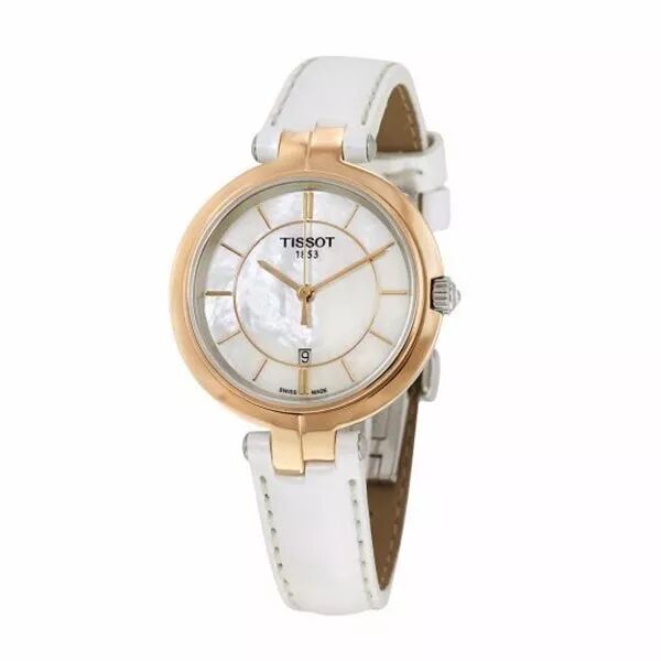 这款Tissot天梭 Flamingo弗拉明女士石英表,采用ETA石英机芯,蓝宝石表镜,26毫米的镀金表壳,白色珍珠母贝表盘搭配金质刻度和指针,质感优雅时尚。生活防水50米。