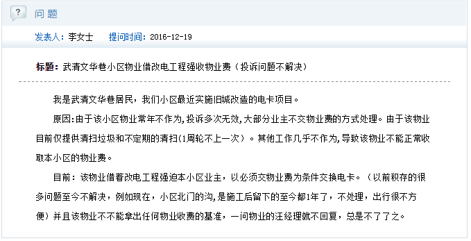 标题:武清文华巷小区物业借改电工程强收物业费(投诉问题不解决)