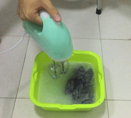 不行,这两种方法都失败了,看来搅拌是不行的。往往这种时候,你就要从中国老祖先那种传承下来的智慧里面去寻找答案。怎么做呢?打衣服。打衣服是我们中国最传统的一种洗衣服的方法。