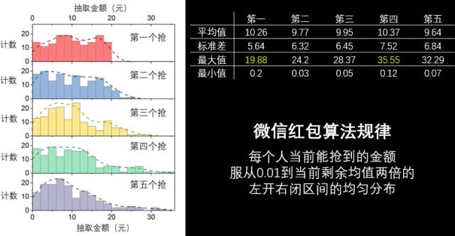 这个结果虽然很简单,但是它反映出来一个现象,就是微信红包的内部算法肯定不是均匀的,先抢后抢一定是有区别的,而且貌似后抢会占一点点优势。
