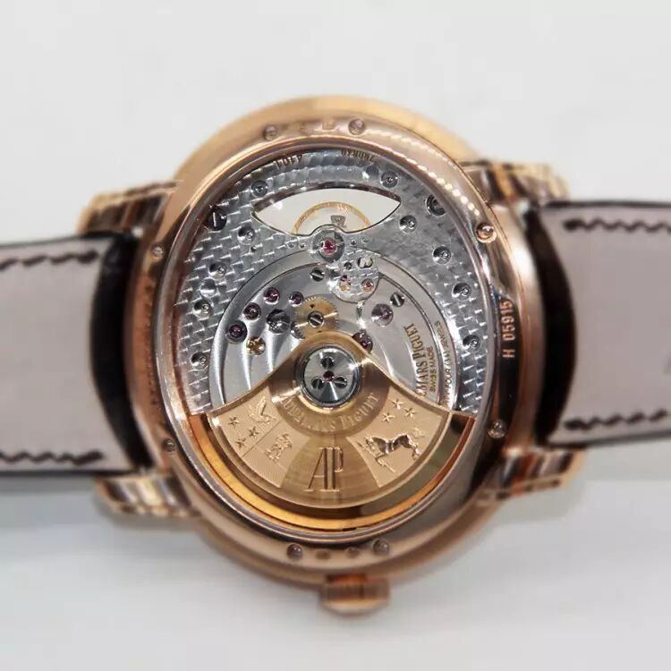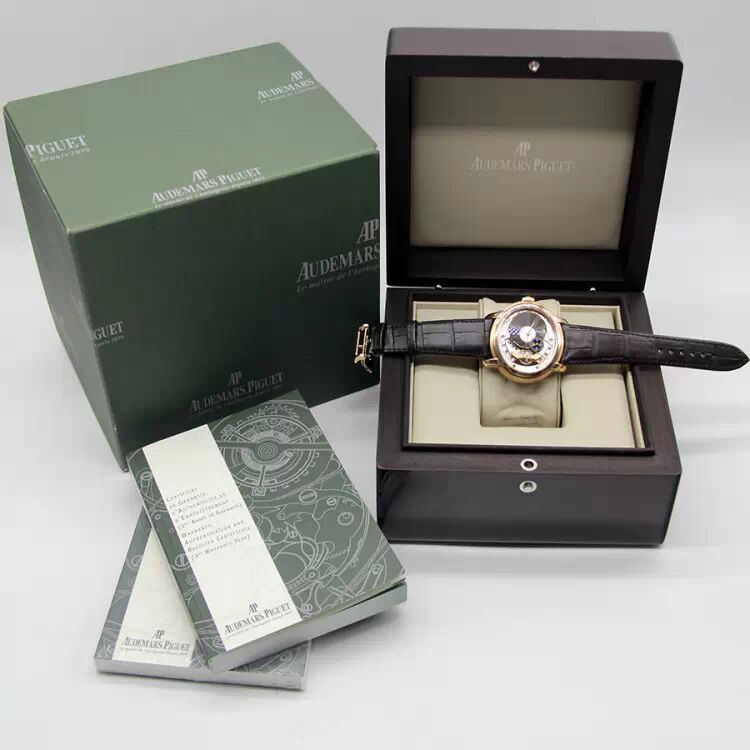 手表业界排名第二的顶级品牌,仅仅略低于百达翡丽。(劳力士这样的一类表和它们无法相提并论的,不在一个梯队;给您完全不一样的体验和身份享受!最新在售款,整表包括表把、表扣、表圈、指针、刻度等全部由18K玫瑰金打造,用金扎实,高贵奢华!47*42MM大表径,专属于Millenary千禧系列的华贵椭圆形表壳,不拘常规,特立独行。表盘的3点位置是让人印象深刻的偏心式表盘与立体罗马数字时标,6点位置设有金针小秒盘。搭载完全由爱彼独家设计、研发与制作的4101自动机械机芯,并采用翻转方式将平日隐没在底盖下的机芯面貌呈现于表盘上,这样的扭转乾坤,再配合位于9点钟位置的擒纵和调节装置,使鉴赏者从外在即可看见腕表核心组件的闪耀夺目。少见的3D立体设计加上与众不同的机芯构造让这款腕表更加杰出。让强调结构与功能的机芯成为整只腕表最重要的美学核心。兼具功能性与设计美感。22K金徽章雕刻摆陀——五星、飞鸽、碉堡、战马象征着至高无上的荣耀!蓝宝石水晶镜面及底盖,原装黑色鳄鱼皮表带,笔直未折叠,18K金AP折叠表扣!