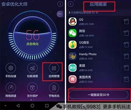第二步:打开【安卓优化大师】-【应用管理】-【应用搬家】-选择可以移动到SD卡的程序-【一键搬家至SD卡】。