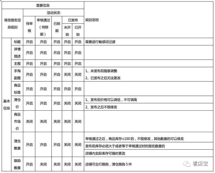 (三)商品审核通过排期后,商家不得私自更换商品,不得增加审核前不存在的相关内容、不得修改活动商品价格(即市场价)、不得修改包邮规则,否则淘宝平台有权取消商家参与本次清仓活动的资格,若商家商品已进行展示的,淘宝平台有权提前结束商品展示时间,且会影响下次报名的审核通过率。