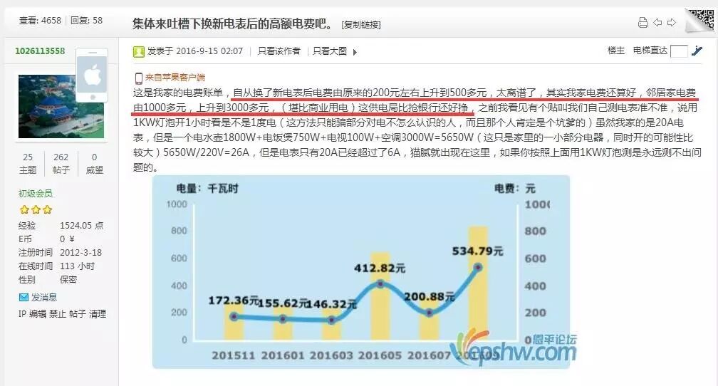 自从换了新的电表,满以为会更加省电,可谁不知,到了交电费的时候令人大吃一惊!家用电费还不止翻了一个倍数!有得更过分的,还倍数后面加个零!下面是网友在自家网站发布的信息: