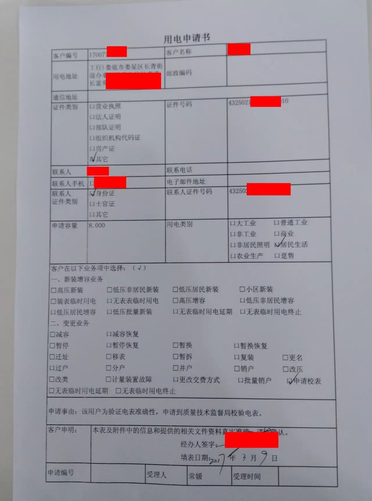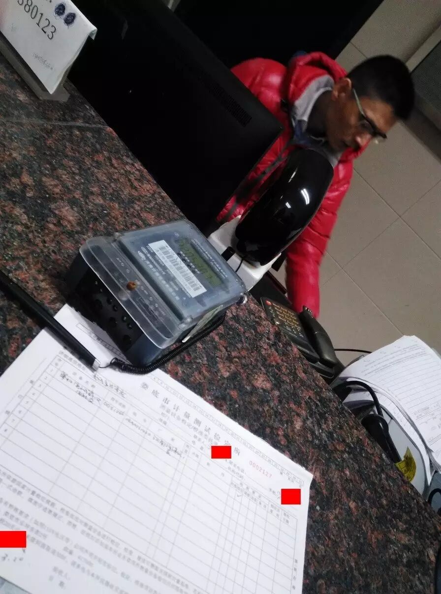第二天3月10日上午9时30分许,接到娄底电力电话,要网友赶回家当面将电表拆下一起送娄底市质量技术监督局进行检测,网友接到电话立即往家赶,10时20分许,娄底电力两名工作人员来到了电表现场,该工作人员说明了相关情况后,10时23分将网友家的电表成功拆下,将表交给网友,网友发现,该电表上面两端均有原始铅封,右侧并有合格证,数据显示为20528.1度,网友与娄底电力工作人员一起赶往娄底市吉星路的娄底市质量技术监督局,10点50分许到达该局,与电力人员一同走进该局的娄底计量测试检定所营业厅,11点15分许网友填写申请报告后,将电表一同交于该所工作人员,工作人员给网友一份回执单,要网友下午接到电话来取电表。