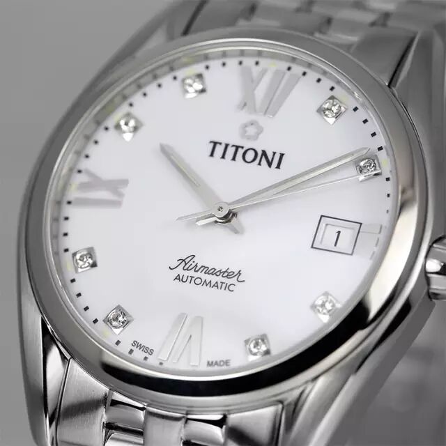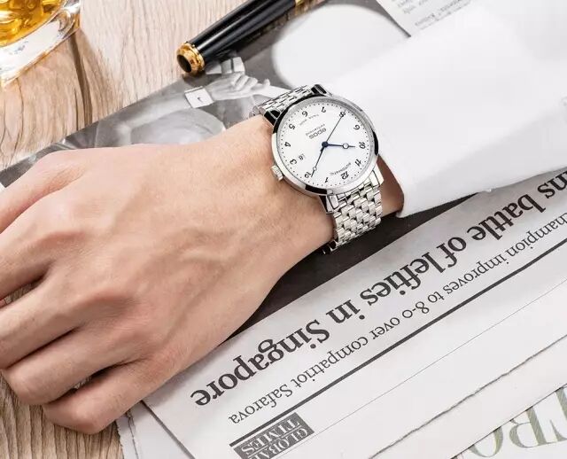 简洁素雅的白色表盘搭配简约的大三针,皓石和经典的罗马数字刻度交相辉映,三点位为小巧精致的日期显示窗口,与表盘搭配相得益彰。