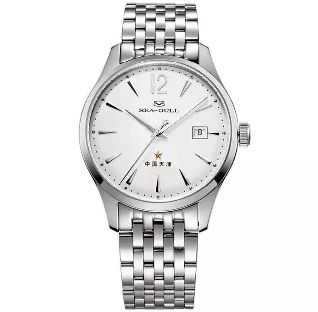 白色表盘搭配经典大三针和钉子型刻度,秒针顶端特别设计为镂空五角星。12点位为海鸥LOGO标志,3点位设有日期显示窗口,6点位刻有一颗金色五角星和“中国天津”字样。