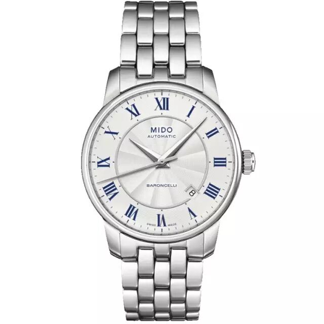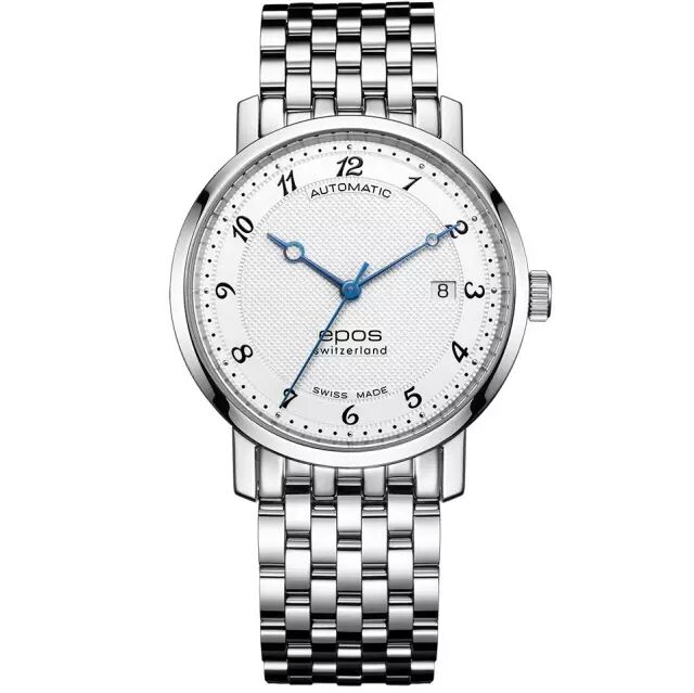 这款腕表表盘直径38mm,厚度9.1mm,表壳采用316L精钢材质。银白色的放射纹表盘配以蓝色的罗马数字时标,让整个腕表变得清新和与众不同,4~5点之间设有日期显示窗口。
