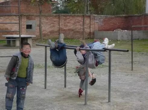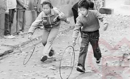我们偷偷拿走车圈当做铁圈去滚着玩