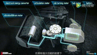 带有铲斗的机械臂通过液压系统实现伸缩折叠,从而摇身一变成为装载机。