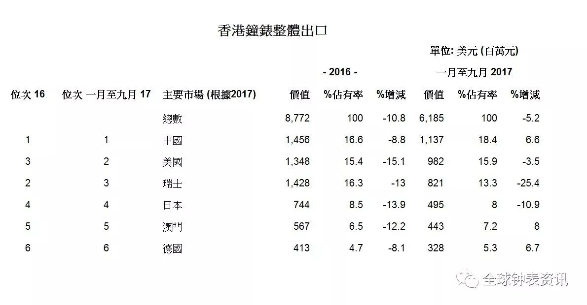 根據香港政府統計處 / 香港貿易發展局最新數據顯示:香港鐘表出口在 2017 年 9 月同比下跌百分之 5.2。但在前 6 位出口市場中有 3 個錄得上升:分別是第一位的中國 (升 6.6%),第 5 位的澳門 (升 8%) 和第 6 位的德國 (升 6.7%),顯示情況審慎樂觀。