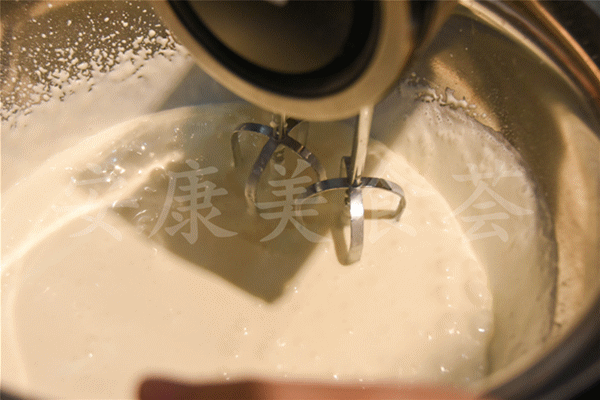 充分搅拌之后用搅拌器提起来有一点钓丝的感觉。这样的奶盖原材料基本就可以投入使用啦~这可是活活打了十分钟左右的成品!