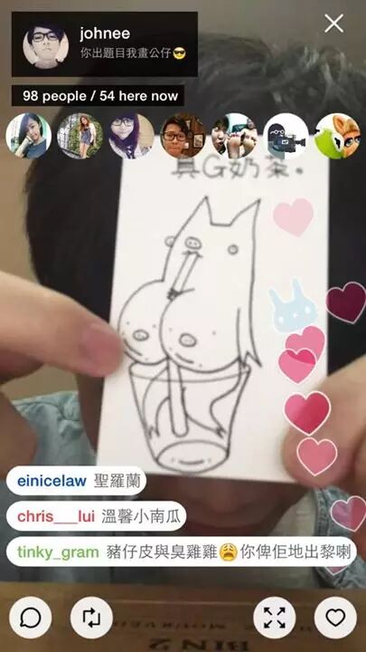 是否人見人愛,確是難以量度,但以知名度來看,Johnee近來人氣增長不少。自利用應用程式直播畫「Faster piece」,短短10日就有3萬人追蹤,更可跨越地域界限,開發台灣、大陸、甚至馬來西亞觀眾。Johnee直言,現在有很多平台供創作者利用,有可與觀眾互動的創意市集,又有連接全世界的網絡,