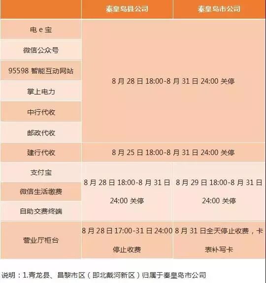 8月28日18:00至8月31日24:00,邮政代收、电e宝、微信公众号、95598互动网站、掌上电力、工行网银、中行网银缴费停止使用;