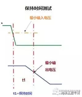 保持时间测量采用相同的测试接线,保持时间是指从输入跌落至最小输入电压开始到输出电压跌落至最小工作电压为止。这项测试指出DC-DC转换器在输入有短时中断或电压跌落时输出的稳定性。有些DC-DC转换器具有输入失败检测信号,此信号亦可作为触发此测试的开关。