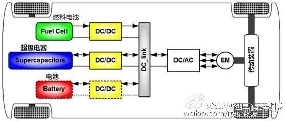 大多数电动汽车和混合电动汽车配置使用两种能量存储装置,高能量存储装置又叫“主能源系统”(MES),另一个具有可逆变能量系统,又称“可充电能源系统”(RESS)。如图一所示,电动汽车可以同时使用燃料电池、动力电池包和超级电容器提供电力驱动,这样可以有效减少成本、体积和提高性能。