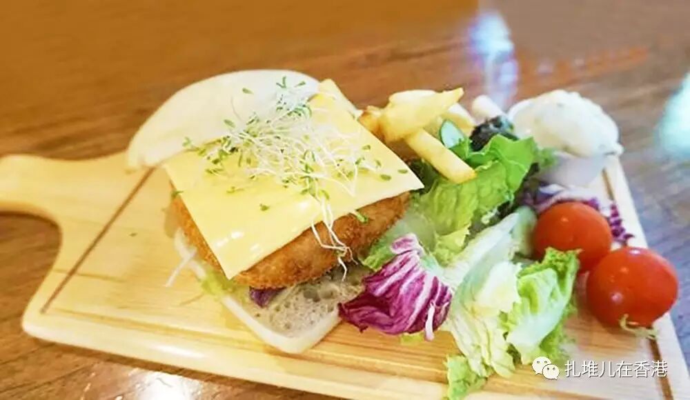 这是中西结合的一道菜,里面是港式炸豆腐和西式汉堡, 汉堡夹着腌过的原块炸豆腐,透过香脆的表皮,能尝到炸豆腐里面的软和滑,再配上些蔬菜,简直棒极了~