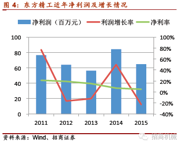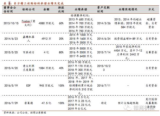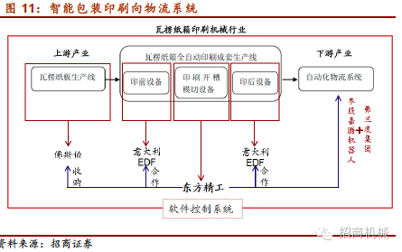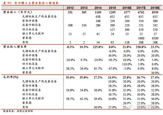 2014年与意大利EDF合作完成瓦楞纸箱全自动印刷成套生产线布局,2016年如期收购EDF100%股权。EDF设立于2009年,是一家位于意大利博洛尼亚的瓦楞纸箱印刷设备全套自动化解决方案提供商,长期专注于瓦楞纸箱印刷机械的印前、印后自动化配套备的研发、生产和运营。目前EDF的产品主要包括预送纸机、分纸机、清废传送设备、智能堆垛设备、粘箱设备及相关配件,2015年收入1.16亿,净利润26万元。收购有利于东方精工瓦楞纸箱印刷设备技术水平提升。公司和意大利EDF共同研发生产的“全自动联动线”(包括FlexyFeed高速预送纸机、IFP高堆收纸清废堆叠机、PRM式计数收纸清废堆叠机、FLEXYPAL堆码机)产品已推向市场,配合东方精工原有产品组合后,即可形成下印式全自动亚太之星(APSTAR)系列成套印刷设备生产线。目前公司已经成为能够同时生产上印式和下印式两大类全自动印刷设备成套生产线的企业。以前东方精工单台印刷机的价格为300-400万元左右,与EDF合作后的“全自动联动线”价格为600-700万元。