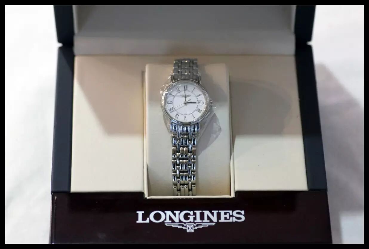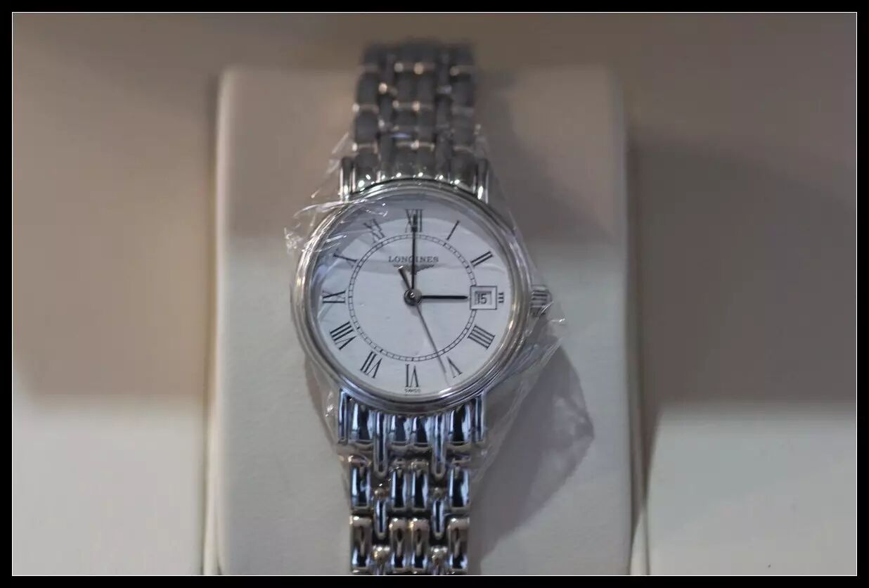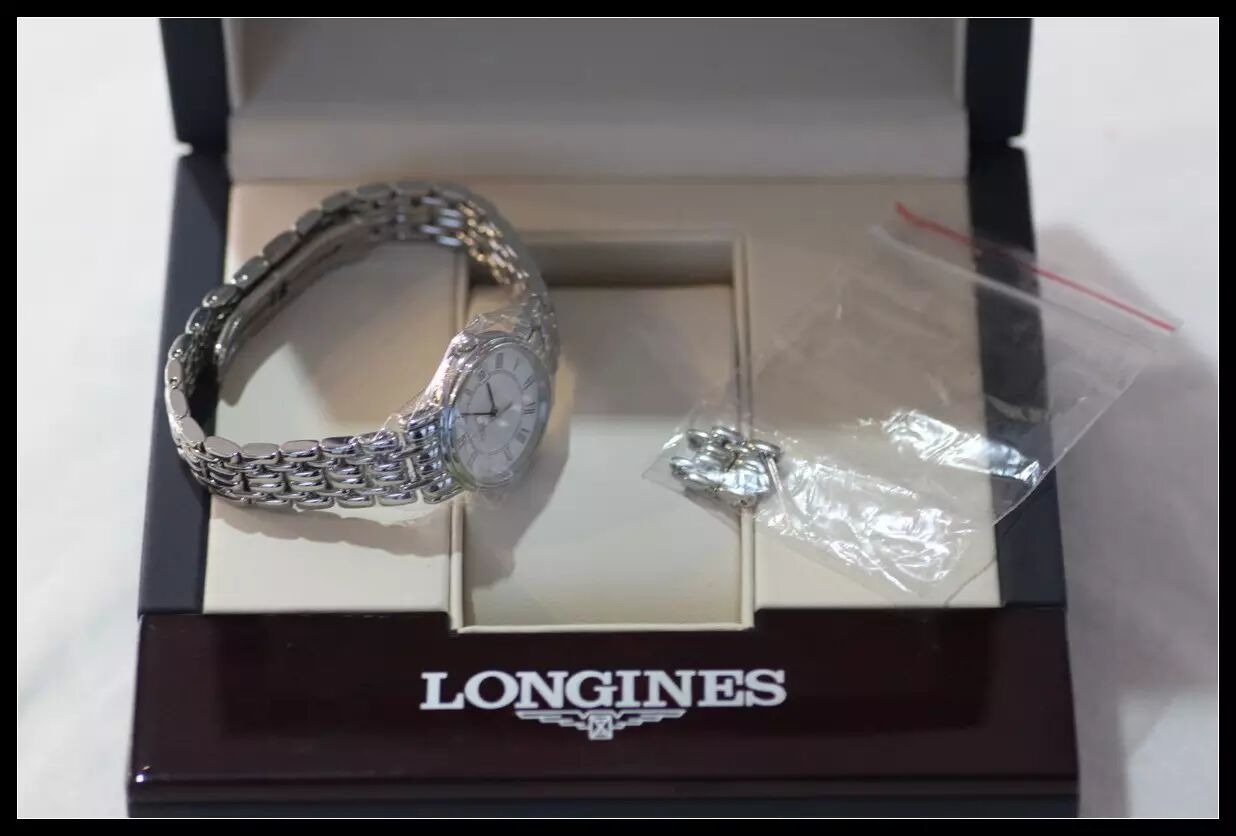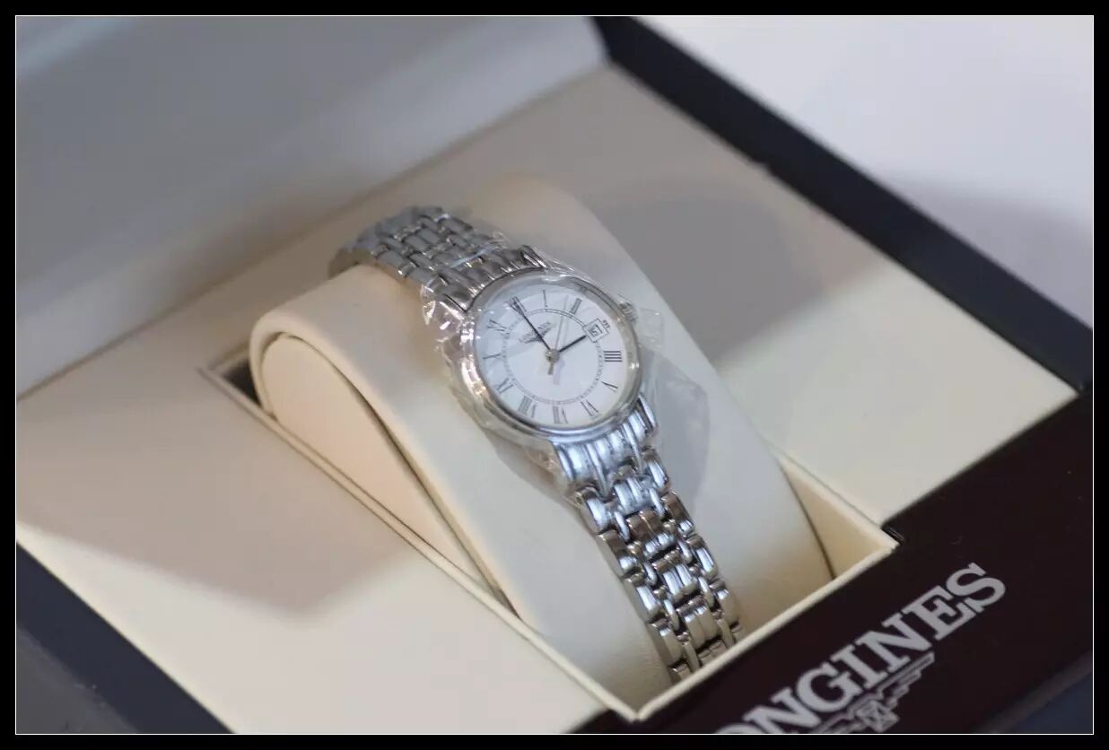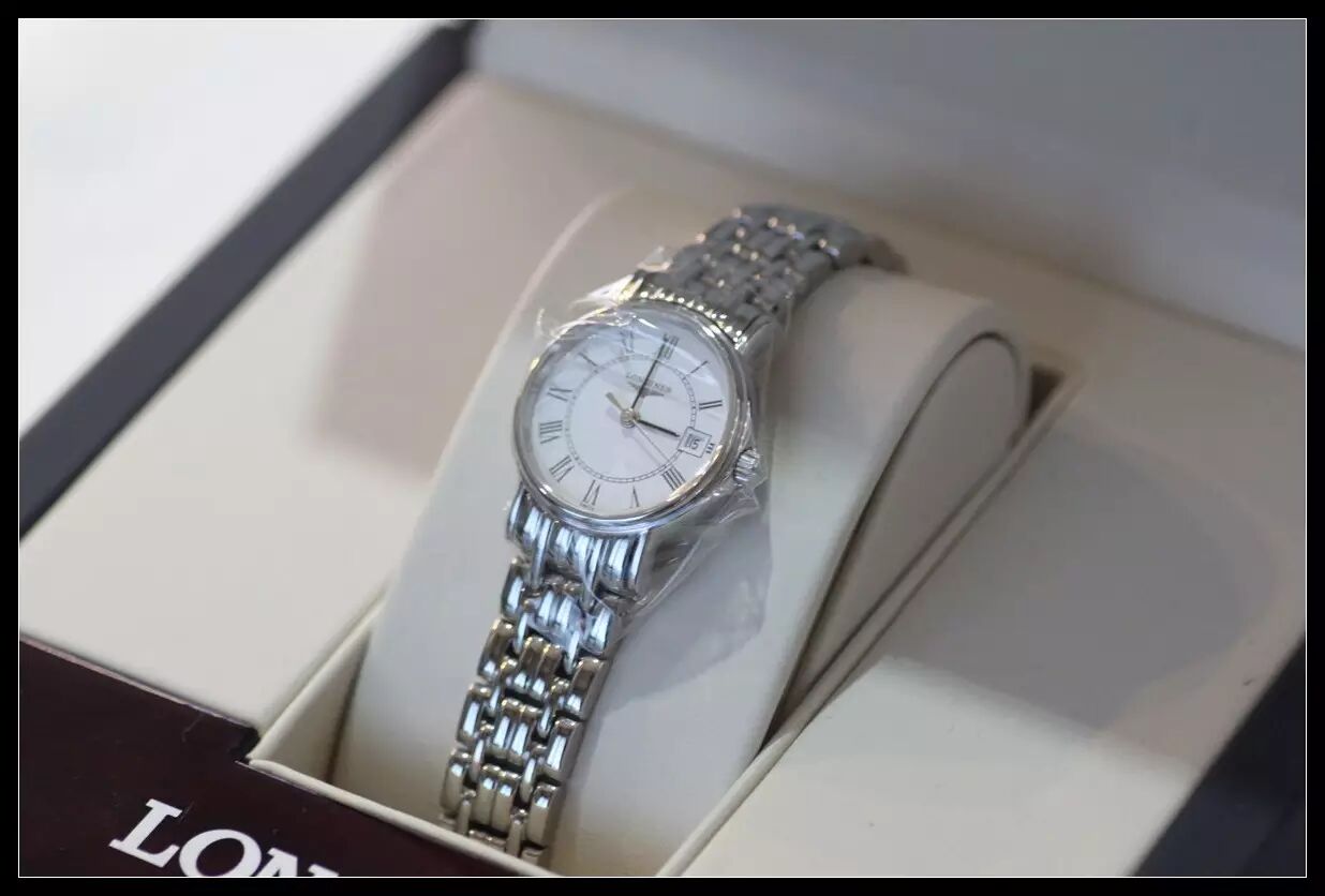 经典浪琴款式,银白色表盘,罗马刻度,蓝宝石镜面。包装盒、说明书齐全。