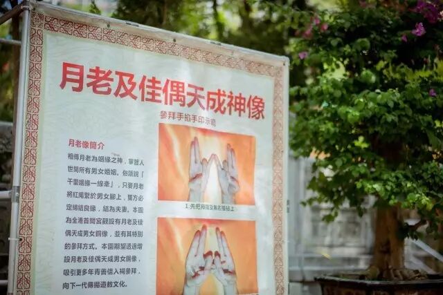 取红绳是不收费的,可以自行随喜放入任意钱币到功德箱。向导和我们说取两条,以为后面做手 工的时候还会用到。系绳子方法很简单,直接绑在月老像旁边的绳柱上就可以了,不过参拜月老的手势就比较复杂了,哈哈哈。