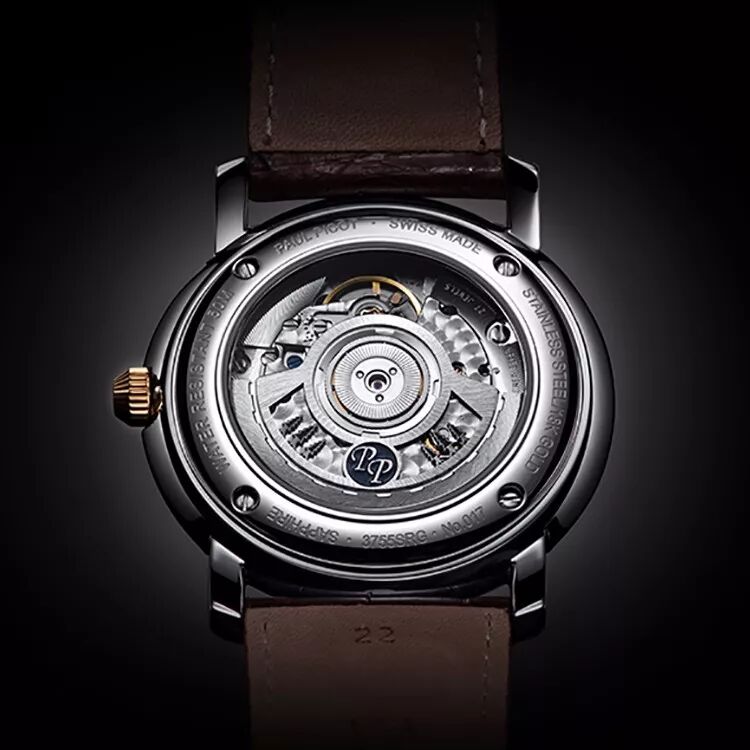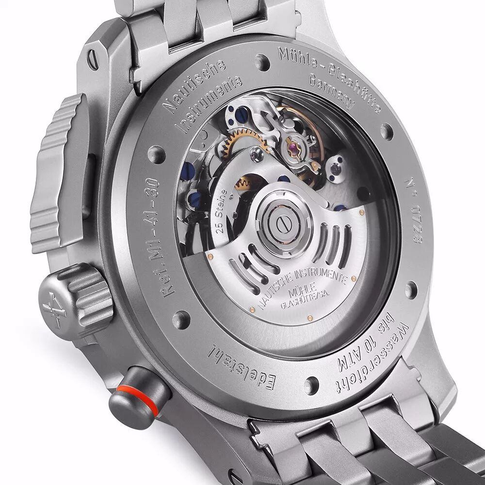 腕表背透设计,内部搭载了背透设计,可以看到腕表内部搭载了MU 9413机芯,且有莫勒专利超强防震啄木鸟颈式微调装置,增强其抗震的稳健性。