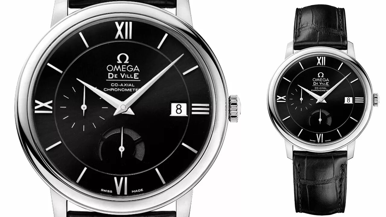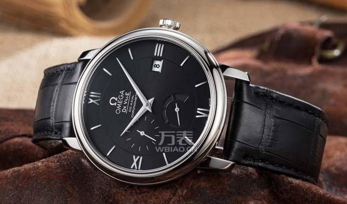 39.5mm表盘尺寸适合亚洲人手腕佩戴,黑色表带更显成熟稳重。腕表搭载自产机芯欧米茄2627, 同轴擒纵系统自动上链,镀铹表面,动力储存达到48 小时。同时6点钟位置的动储显示隐去刻度显示,独具特色。