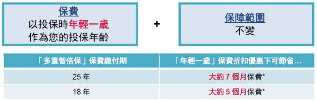 于2017年10月10日至11月30日(「推广期」),客户成功投保「多重智倍保」可享「年轻一岁」保费折扣优惠: