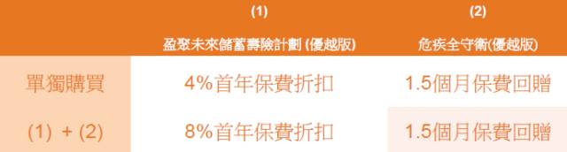 于2017年10月10日至12月31日(「推广期」),凡成功投保「赢聚未来」储蓄寿险计划(优越版)、「危疾全守卫」(优越版)可享受保费回赠优惠: