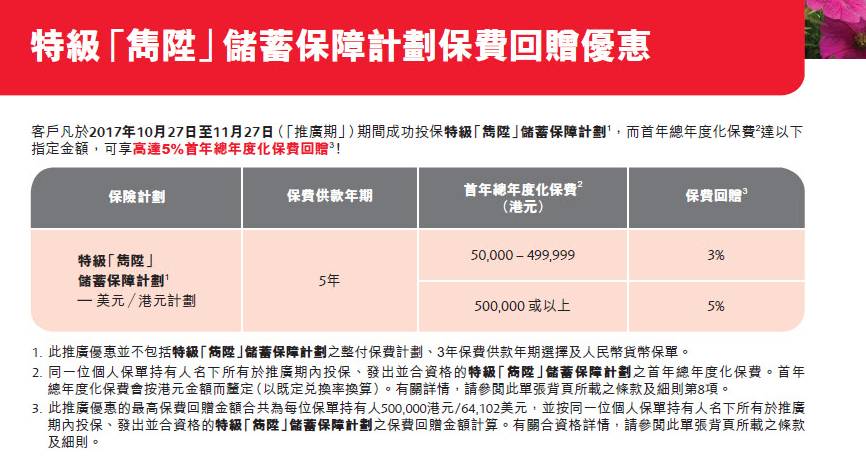 于2017年10月10日至10月26日(「推广期」),客户成功投保「特级隽升」储蓄计划,可享受保费回赠优惠: