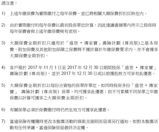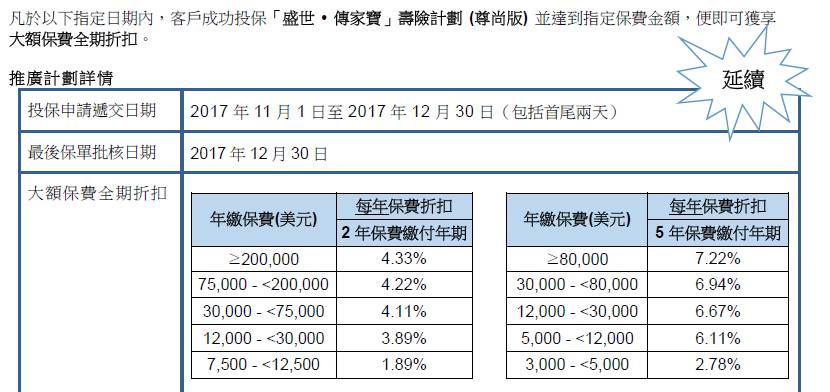 于2017年11月1日至12月30日(「推广期」),客户成功投保「盛世传家宝」寿险计划(尊尚版),可享受保费回赠优惠: