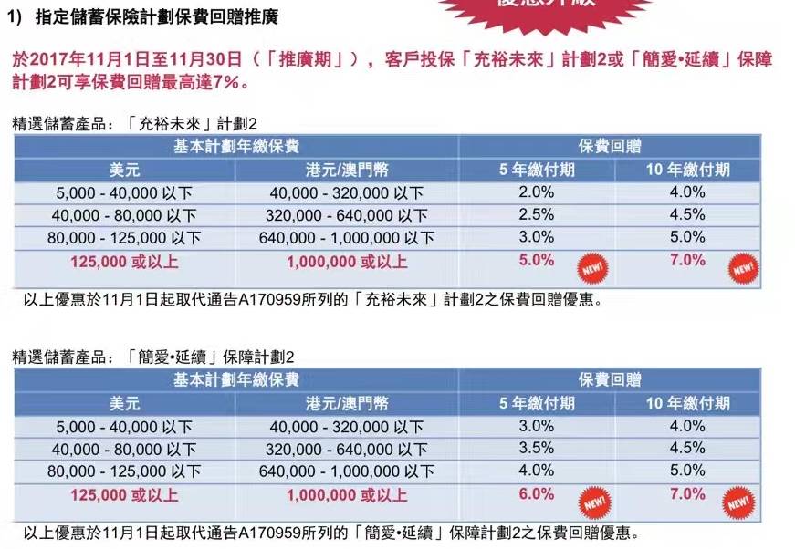 于2017年10月10日至11月30日(「推广期」),客户成功投保「充裕未来」储蓄计划,可享受保费回赠优惠: