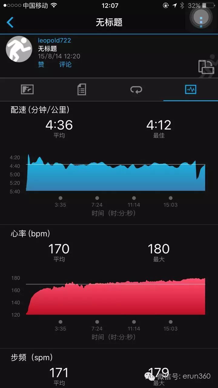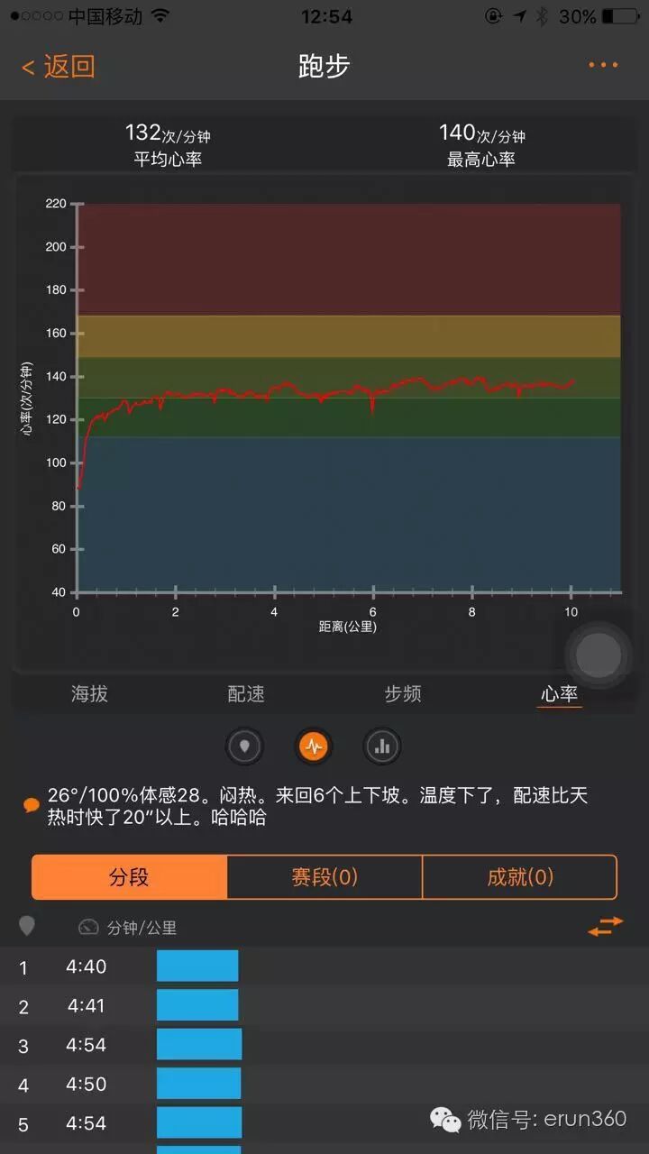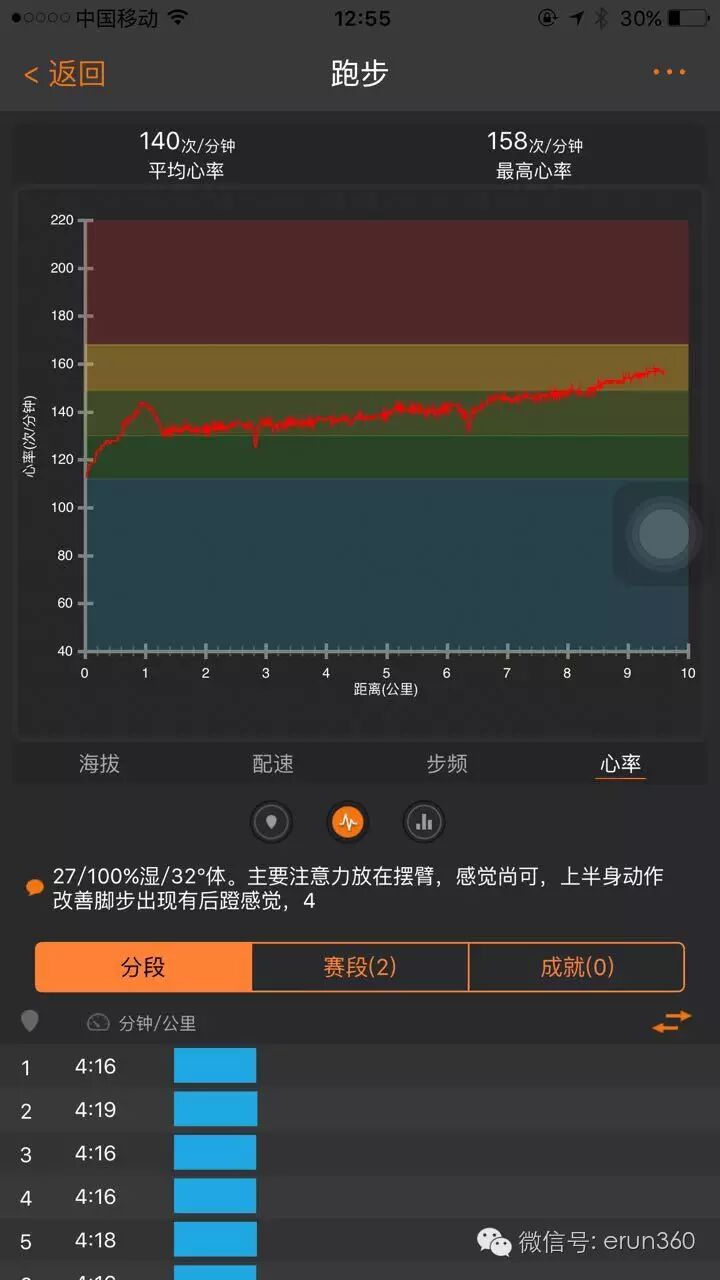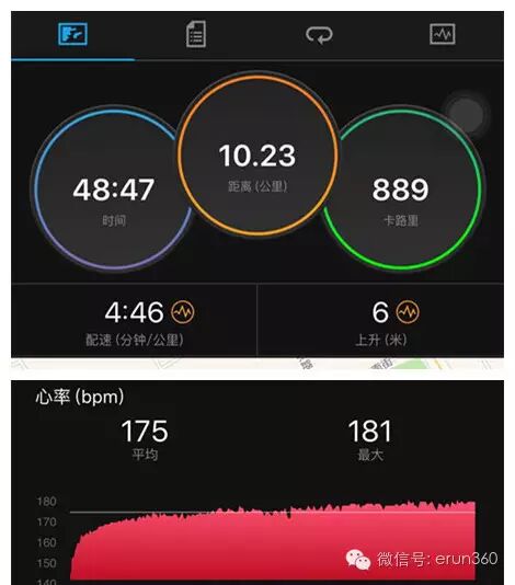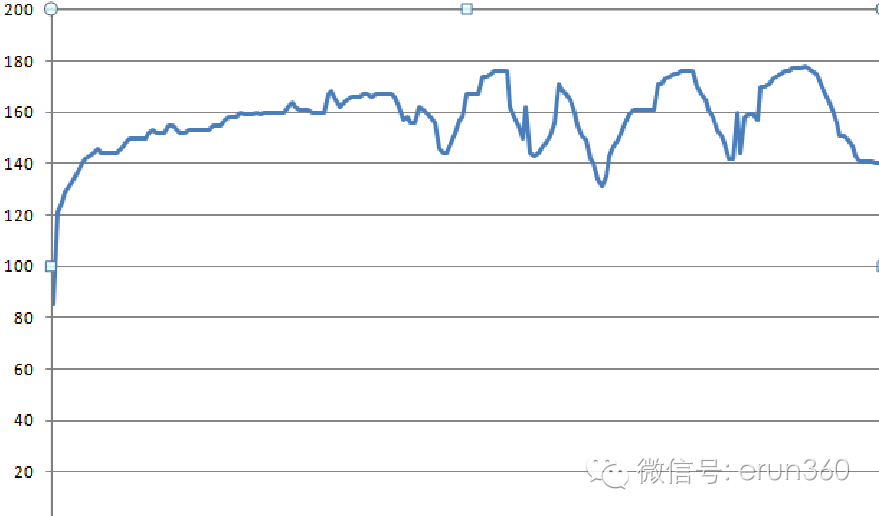 笔者根据公式测得的最大心率应该为195上下,而前几次跑步用到的都是中等配速,按自身感觉应当属于区间3到区间4的范畴,但是手表统计的结果平均心率已经到了170以上,接近无氧运动区间5,。怕是手表不准于是借用朋友的心率带测试了两次,心率还是很高。话说那段时间战战兢兢的,误以为自己心脏有问题都一度不敢出去跑了。而作为对比,有一个年龄速度和我相仿的跑友,心率总维持在很低的范围内,即使是跑到极限也超不过160,。