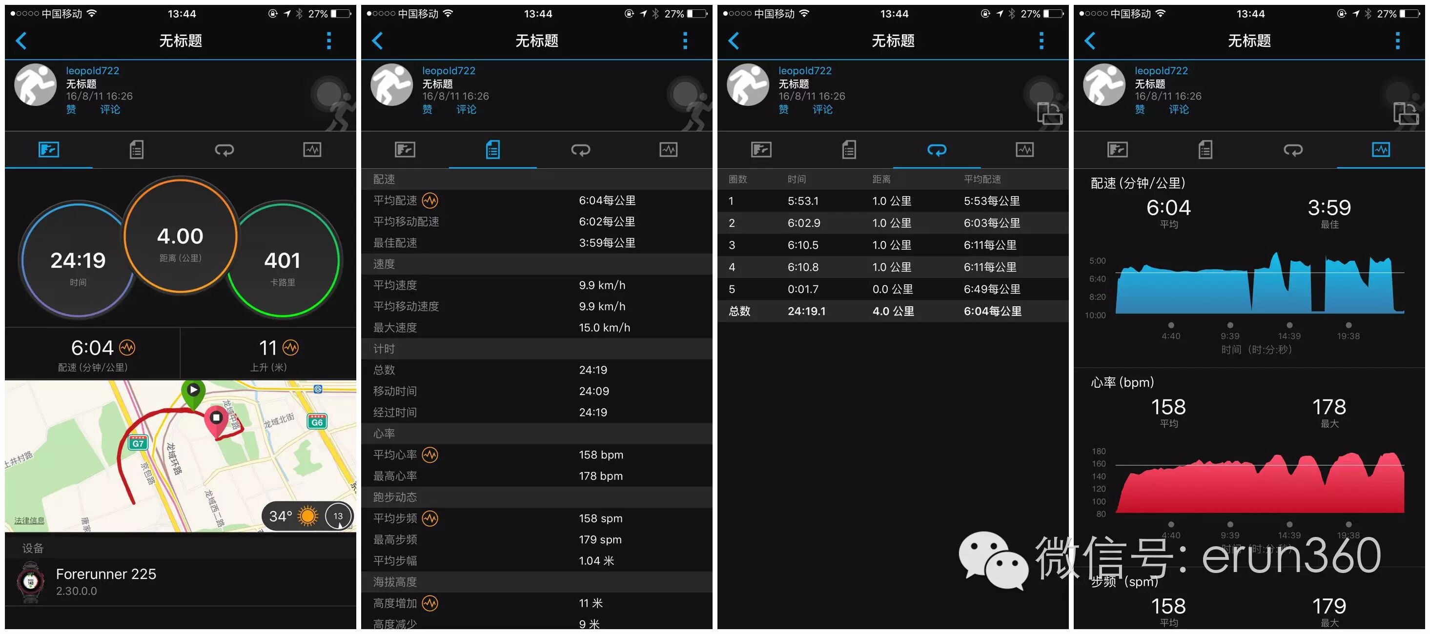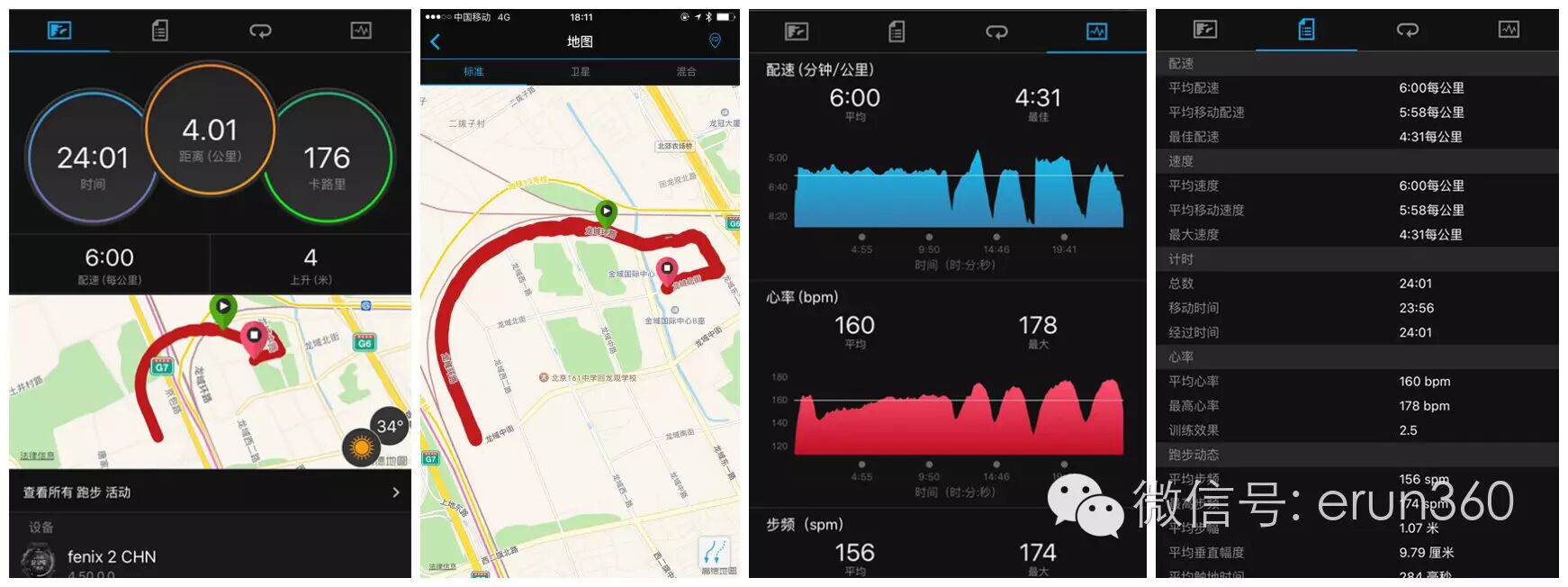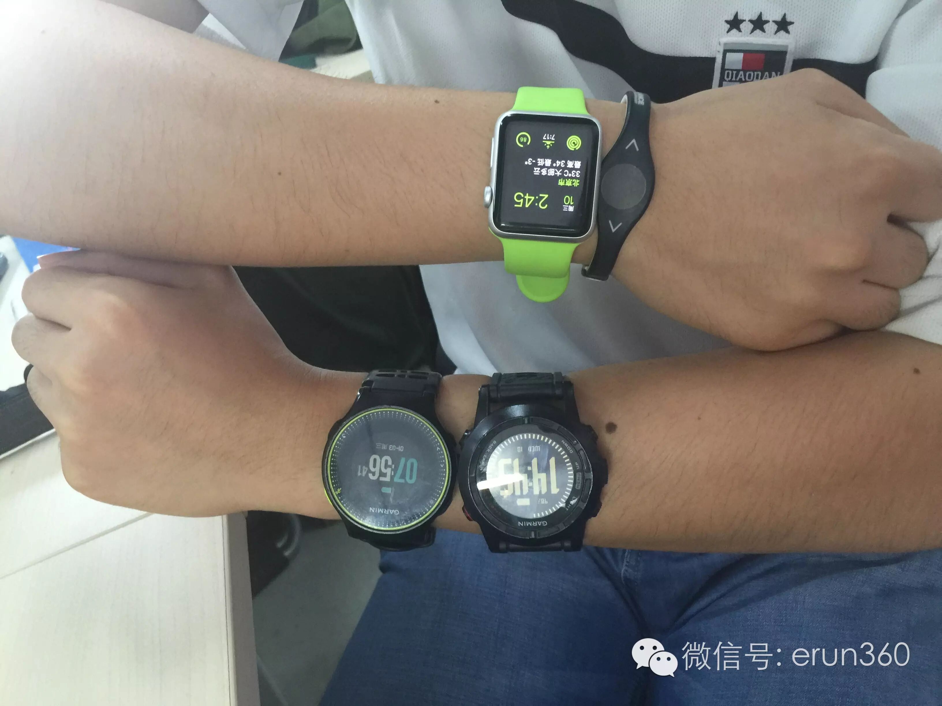 试验用到了目前比较有代表性的几款产品,Apple-Watch、Garmin 225、Fenix2手表配智能心率带,公路跑4km,非匀速,温度33℃,Garmin connect版本3.9.0.8