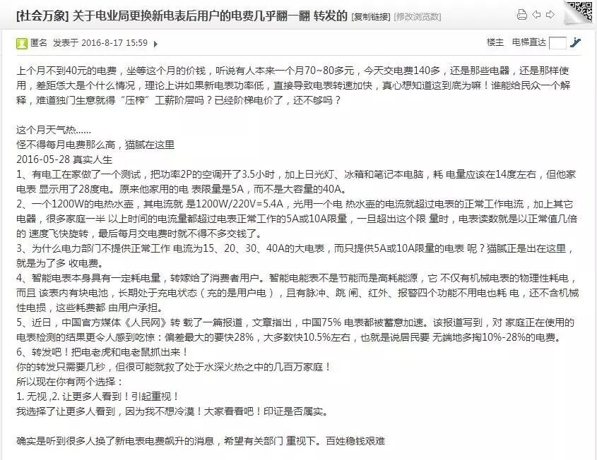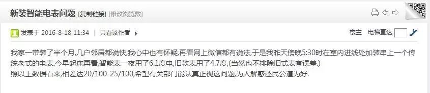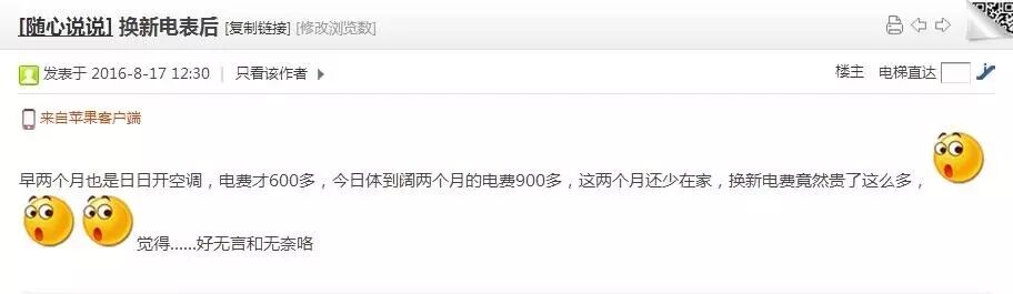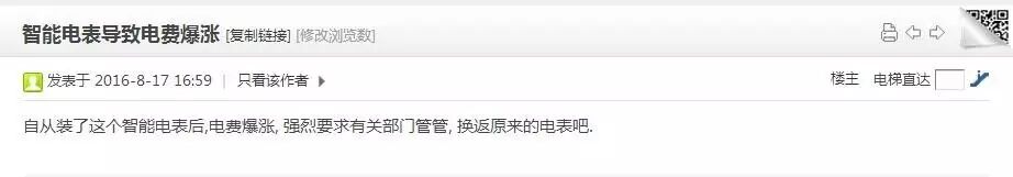 帖子原文:自从装了这个智能电表后,电费爆涨, 强烈要求有关部门管管, 换返原来的电表吧.