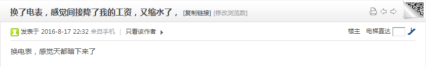 帖子原文:上个月不到40元的电费,坐等这个月的价钱,听说有人本来一个月70~80多元,今天交电费140多,还是那些电器,还是那样使用,差距恁大是个什么情况,理论上讲如果新电表功率低,直接导致电表转速加快,真心想知道这到底为嘛!谁能给民众一个解释,难道独门生意就得“压榨”工薪阶层吗?已经阶梯电价了,还不够吗?