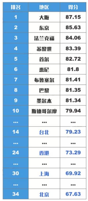 在这个指标中,总体均分为69.2,香港排名24,得分73.29,这也是所有分类排行中香港唯一没有进入前10的项目。而台北表现比香港好,排名全球14,得分79.23;上海排名30,得分69.92;北京排在上海之后,为第34名,得分67.63。