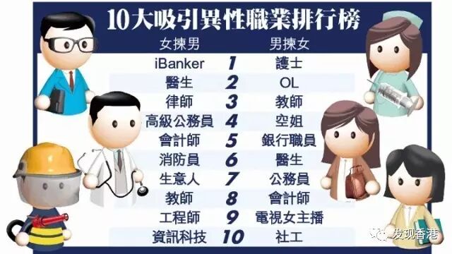 报道又综合多间婚介及速配公司的资料,得出「10大吸引异性职业排行榜」,指女性最喜欢找iBanker为对象,其次为医生、律师、高级公务员、会计师、消防员、生意人、教师、工程师和资讯科技(I.T.)人员。至于男性最喜欢伴侣从事护士,其次是OL、教师、空姐、银行职员、医生、公务员、会计师、电视女主播和社工,主要皆为文职系。