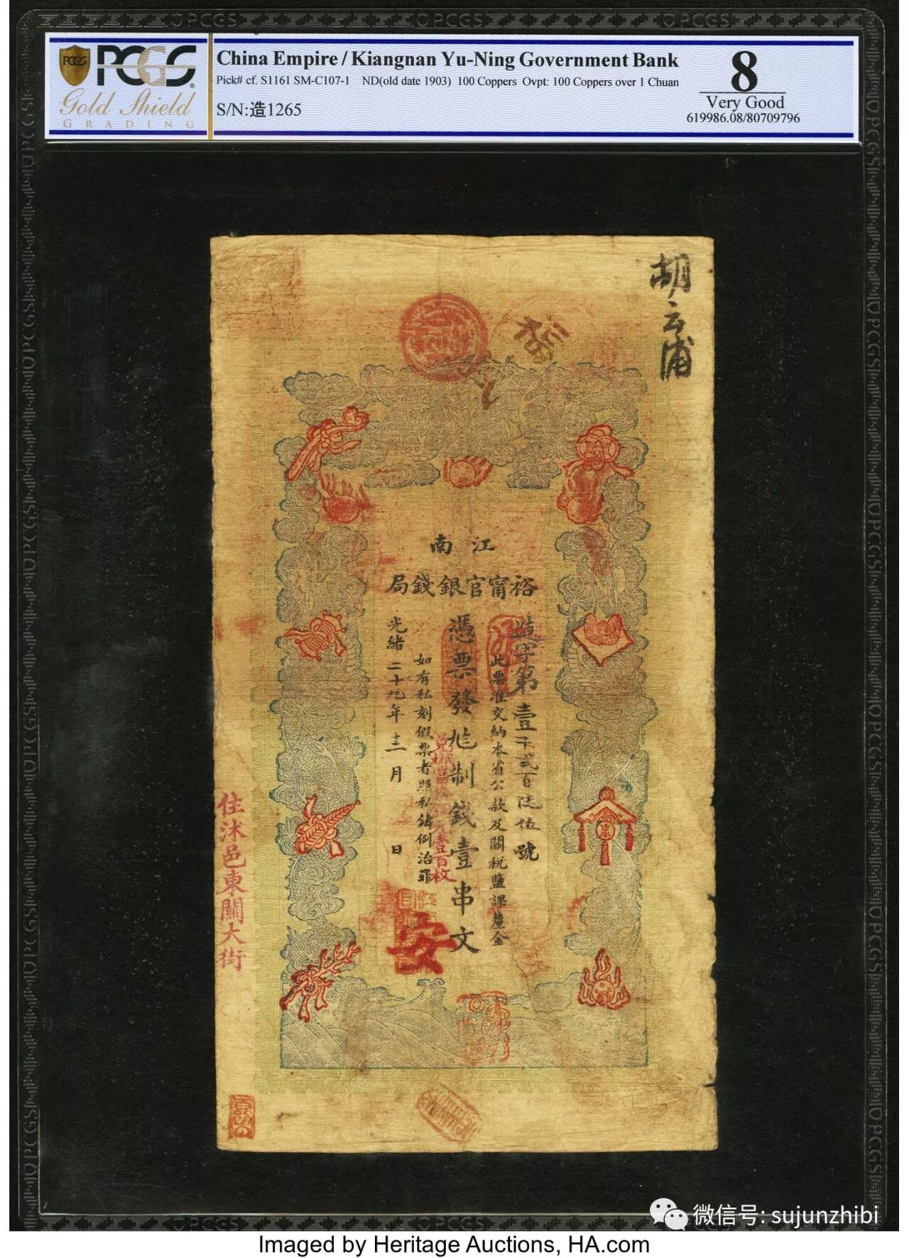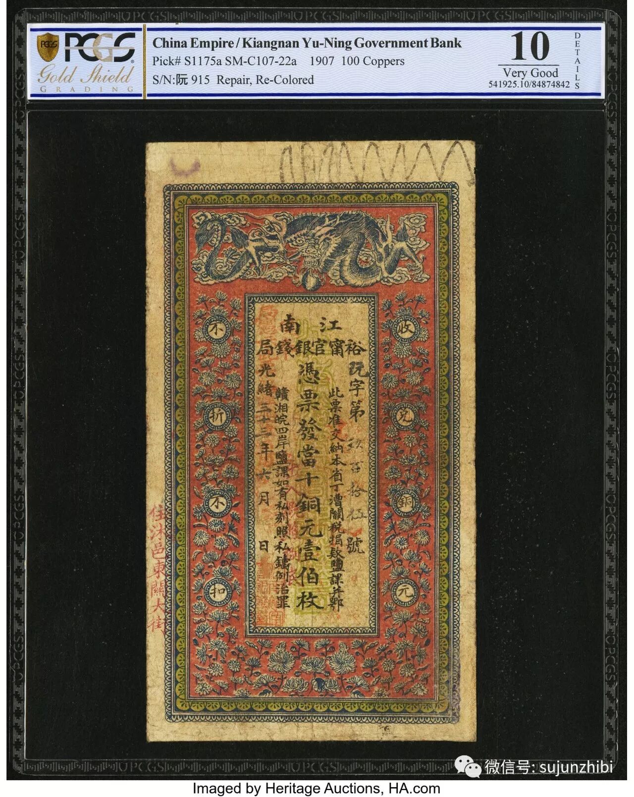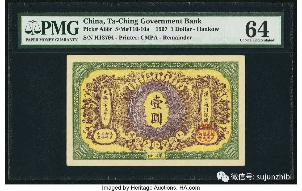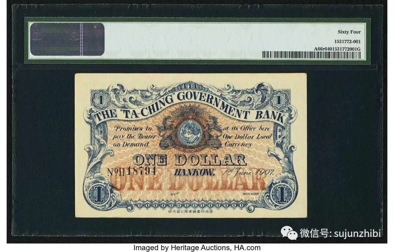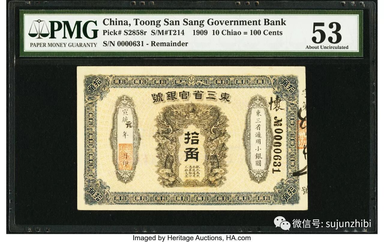 此枚由滿州東三省官銀號發行的紙鈔,有龍紋圖案,畫面生動。這些早期鈔票與1907至1909年大清銀行發行的出品一樣,於本地印刷。然而,由於當時它們被大規模回收,替換成外地印刷的鈔票。因此,現存的鈔票,包括這張印墨出色,而品相少有使用痕跡的一枚,可謂非常珍貴。