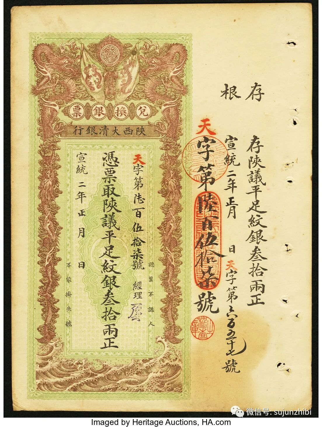 陕西大清银行,辛亥兵乱,钞票曾被抢失:嗣后设处清理,根据当时发柜库存两项账簿,详加查核,内实在行使钞票,计共七万余两除历年陆续收回外,截至本年五月间,未经收回之票,尚有银票三万零九百三十五两八钱。 此券为1988年,长武县发现几十张“陕西大清银行银两”纸币中的一种。