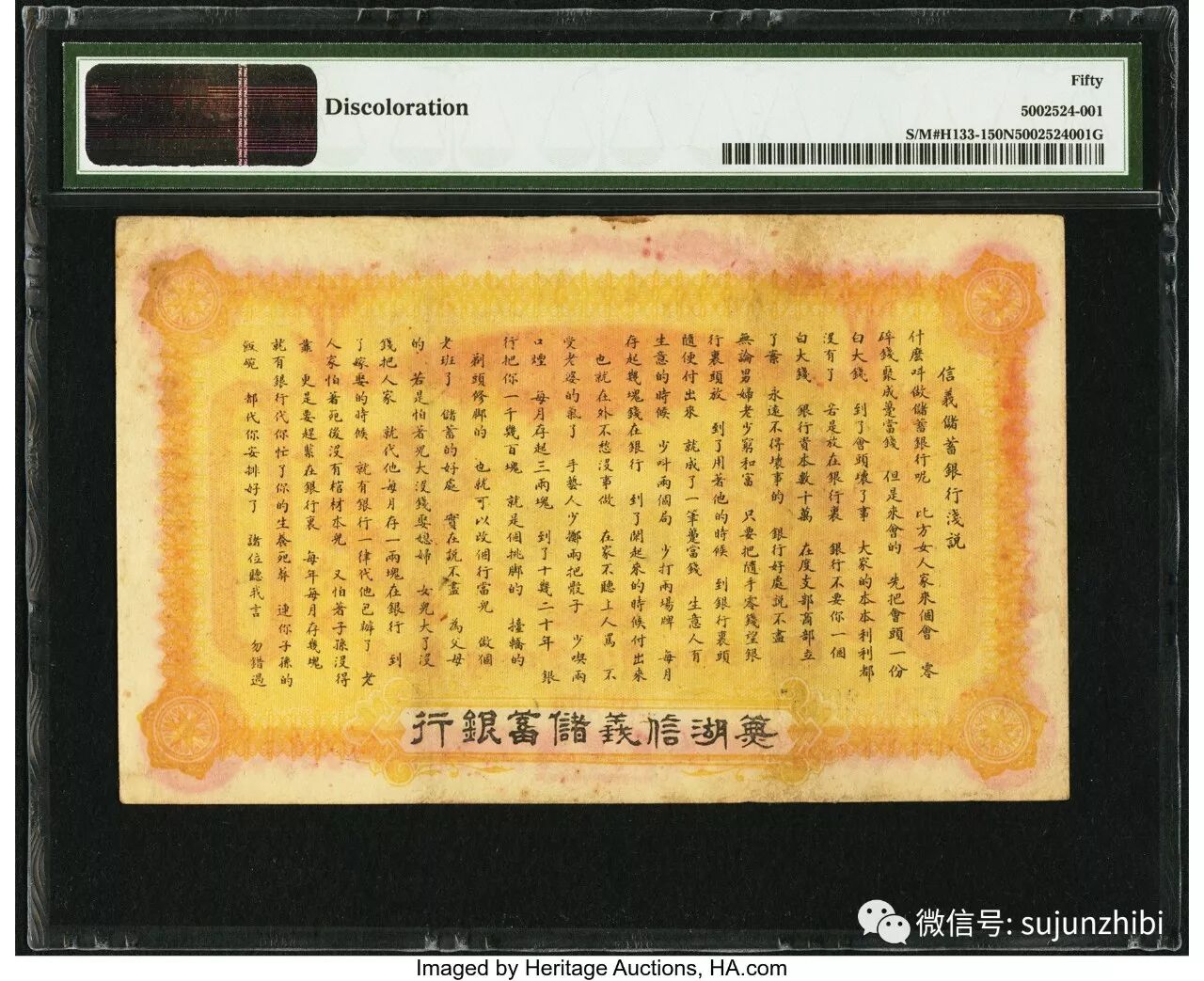 简介:信义储蓄银行开办于光绪三十二年(1906年)十月,兼营商业、储蓄两种业务,有发行钞票的权利。其前身为信义工商储蓄银行,创办者为江苏镇江尹寿人(克昌),总行设在镇江,并在上海、汉口、武昌、北京、扬州、南昌、芜湖、长沙、湘潭、宜昌等地设有分行,于各大商埠主要经营储蓄业务,但也取得了发行特权。该行为了吸收更多的存款,在所发行的横式钞票背面印有为吸引更多存款的广告文字——《信义储蓄银行浅说》,共415个字,其内容是针对社会上男女老少、各种职业人员宣传储蓄的益处。全文如下: