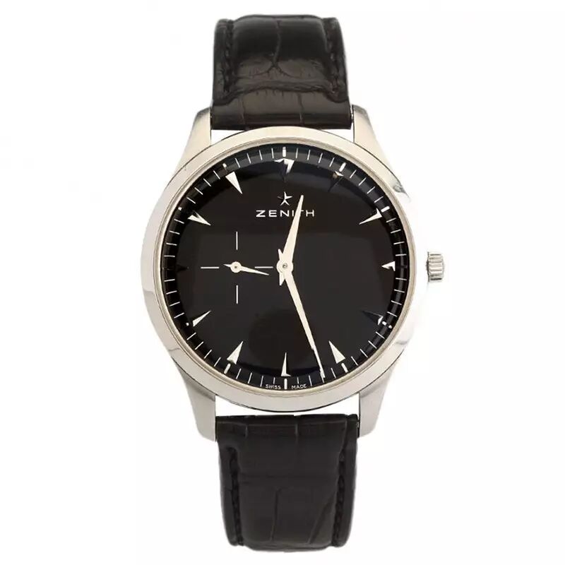 精钢圆形表壳、蓝宝石表镜、黑色表盘、鳄鱼皮表带、生活防水、9点位置小秒针,表盘整洁大气。
