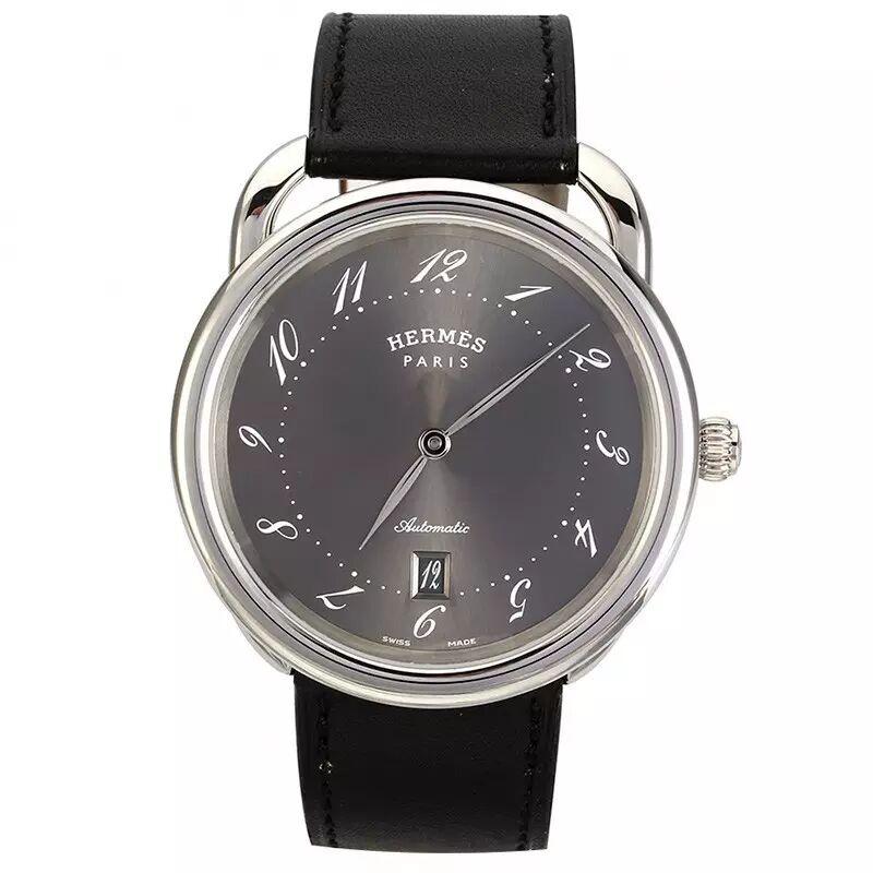 爱马仕 Arceau系列 自动机械男表:精钢圆形表壳,蓝宝石表镜,独特灰色表盘,牛皮表带,带有日期显示,生活防水。