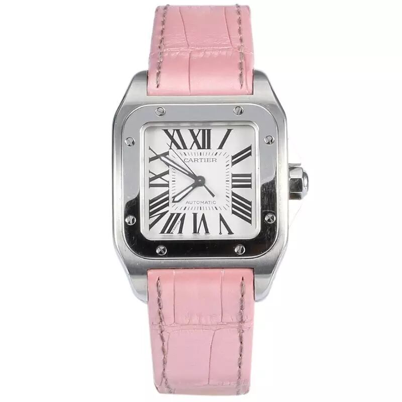 卡地亚桑托斯系列女士腕表,方形精钢表壳,粉色鳄鱼皮表带,自动上链机芯